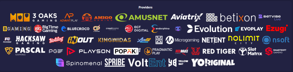 Slots come from Pragmatic Play, Play'n GO, NetEnt, Red Tiger, Big Time Gaming, Nolimit City, Hacksaw Gaming, and Relax Gaming. Each game shows its RTP and volatility level before you start.